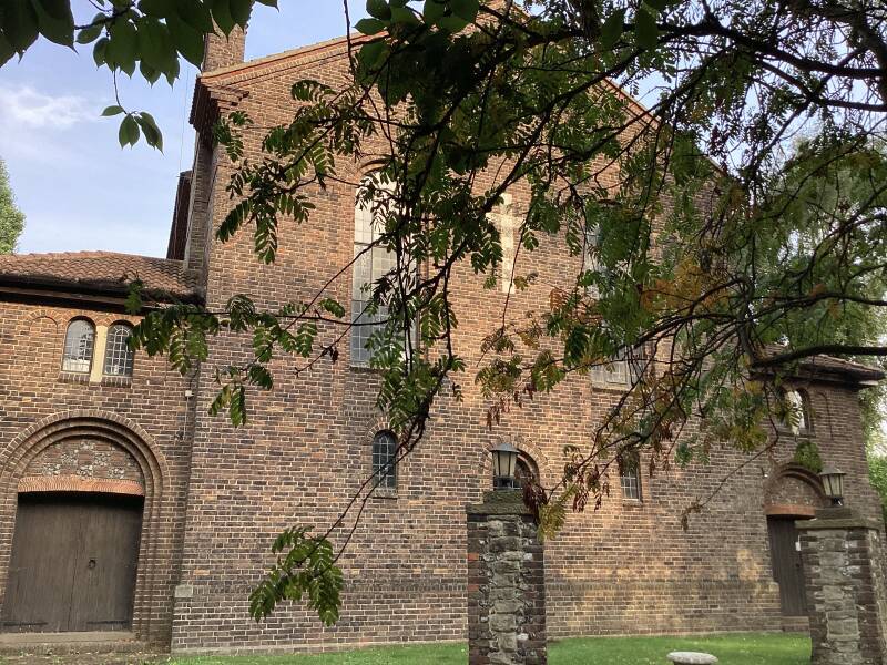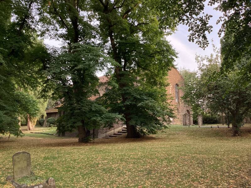 The church was to the SOUTH of the buildings, as the slopy site is between marshes and wooded hills.