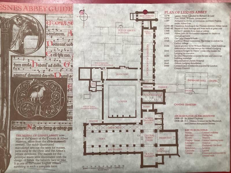 I have used this LESNES ABBEY GUIDE, a leaflet produced in 1986 by the GLC Historic Buildings Division